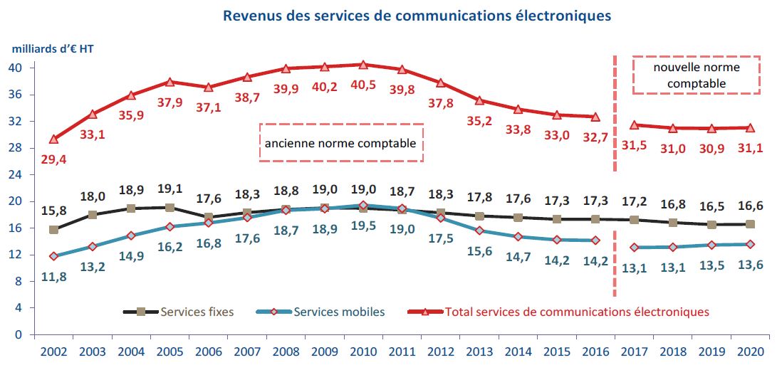 Le revenu des opérateurs de services de communications électroniques (35,3 milliards d’euros HT) diminue de 0,5 % en un an en 2020, avec un marché des services de communications électroniques grand public en nette croissance.