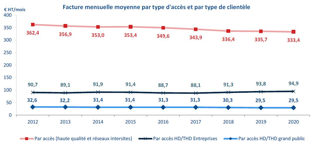 En moyenne, une entreprise dépensera environ 95 euros HT par mois pour un accès internet à haut ou à très haut débit, soit trois fois plus qu’un particulier, et près de quatre fois plus si elle souscrit une offre plus élaborée notamment en termes de fonctionnalité et de qualité de service (accès de haute qualité), et/ou qui lui permet de raccorder plusieurs de ses sites (« réseaux intersites »).