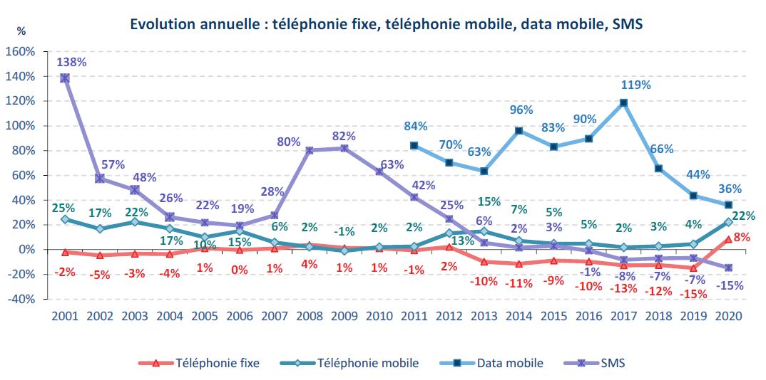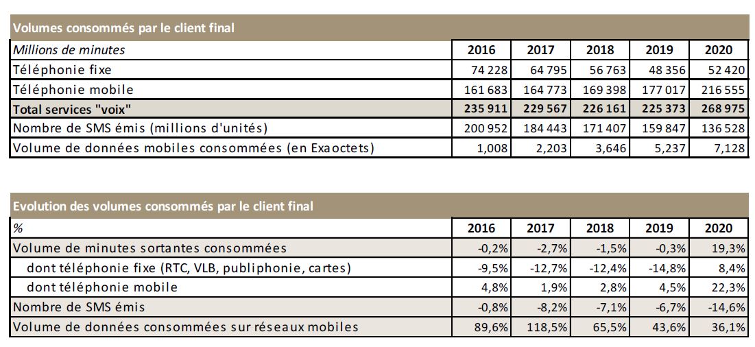 Alors qu’elle n’augmentait plus depuis 2014, la consommation vocale depuis les réseaux fixes et mobiles, 269 milliards de minutes en 2020, progresse fortement depuis le début de la crise sanitaire (+ 19 % sur l’ensemble de l’année 2020), et plus particulièrement durant le premier confinement (+ 30 % environ en un an au deuxième trimestre 2020).