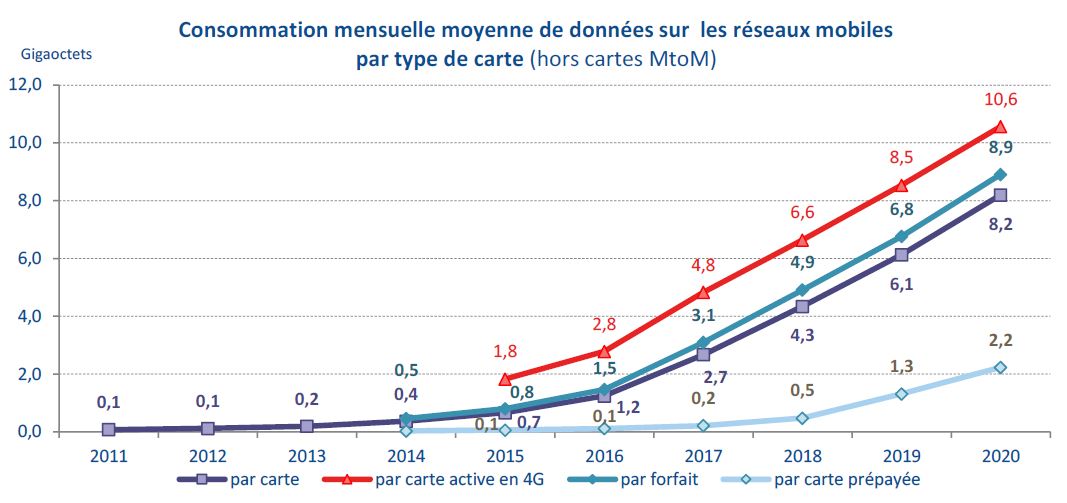 A l’inverse, la pandémie a accéléré le recul de l’usage du service SMS par les clients résidentiels : de- 10 % par an depuis 2017, il atteint - 16 % en 2020 pour les clients résidentiels détenteurs de forfaits. Leur consommation moyenne s’élève ainsi à 193 messages par mois en 2020. Les entreprises, qui avaient stabilisé leur consommation à environ 90 messages par mois depuis 2016, voient, quant à elles, leur consommation diminuer de 15 % en un an en 2020. Concernant la consommation de données sur réseaux mobiles (7,1 exaoctets sur l’ensemble de l’année 2020), la tendance à la hausse se maintient à un rythme élevé, autour de + 35 % en un an, pour les deux types de clientèle. L’usage mensuel moyen de données atteint jusqu’à 10,6 gigaoctets par carte SIM et par mois pour un client actif 4G, soit + 24 % en un an. Les entreprises (4,2 Go, + 28 %) consomment près de deux fois moins que les clients résidentiels utilisant des contrats forfaitaires (9,7 Go, + 70 %).