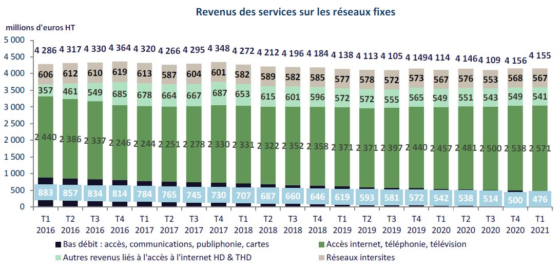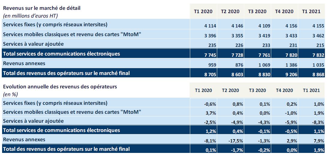 Le revenu des opérateurs, 8,9 milliards d’euros HT au premier trimestre 2021, connaît globalement une amélioration depuis le quatrième trimestre 2019, et une croissance sur pratiquement tous les postes de revenus ce trimestre (services fixes, mobiles et revenus annexes).