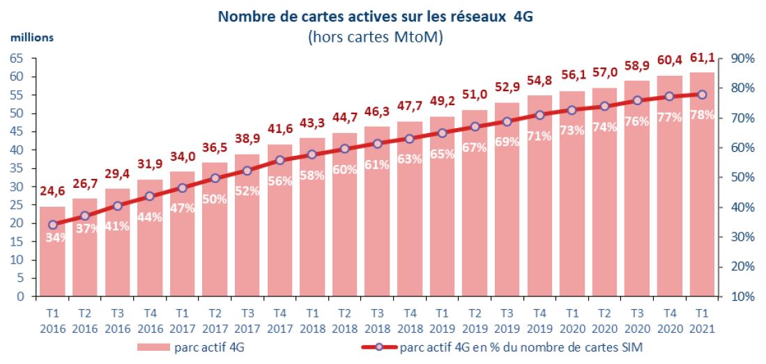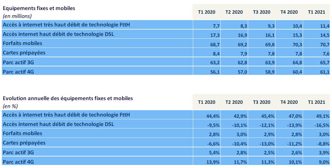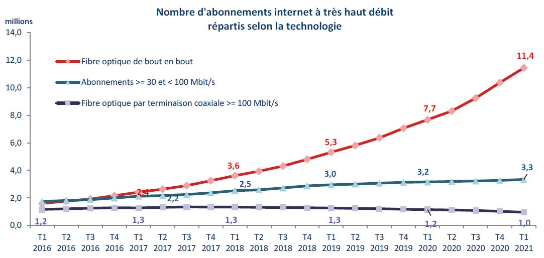 Au 31 mars 2021, sur un total de 30,9 millions d’accès internet,15,7 millions sont à très haut débit (51%, +11 points en un an), au sein desquels une large majorité (73%, +9 points en un an) est de technologie FttH.