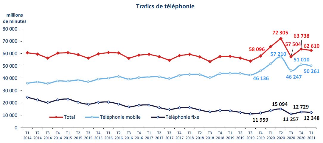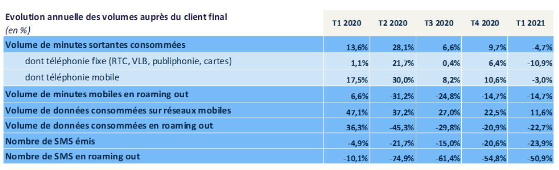 La consommation vocale depuis les réseaux fixes et mobiles diminue à nouveau ce trimestre après un acroissement exceptionnel tout au long de l’année 2020.