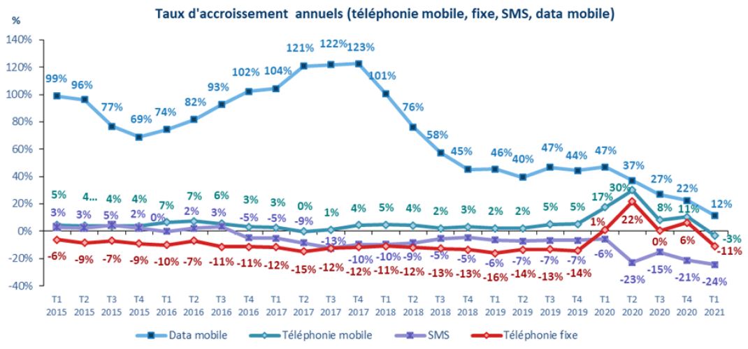 Enfin, les SMS, dont l’usage diminue au profit des applications mobiles, voient à nouveau leur recul s’accentuer : -24% ce trimestre, après -21% au quatrième trimestre 2020, -15% au troisième et -23% au deuxième.