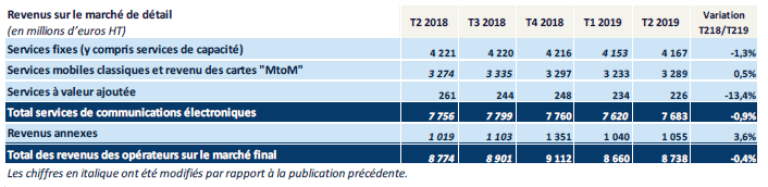 Le revenu des opérateurs sur le marché final diminue faiblement ce trimestre (-0,4% en un an) après trois trimestres consécutifs de contraction autour de -2% par an.