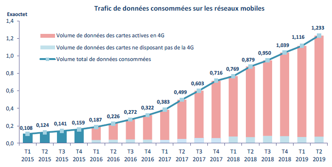 | L’usage de la data sur les réseaux 3G et 4G continue de progresser à un rythme soutenu ; chaque trimestre, le volume de données (+40% en un an, 1,2 exaoctet dont 2% consommés à l’étranger) et la consommation moyenne de données augmentent : 5,8 Go par carte SIM (+40%). Les utilisateurs des réseaux 4G consomment également de plus en plus de données. Cette consommation atteint 8,3 Go par mois (+25% en un an) pour leur usage en mobilité et environ 140 Go pour leur usage fixe depuis une box internet. En revanche, le SMS est de moins en moins usité ; depuis plus deux ans, la consommation moyenne (184 SMS par mois en moyenne, -17 SMS en un an ce trimestre) et le volume global (40 milliards, -7,2% en un an) diminuent. C’est également le cas, depuis le début de l’année 2019, de leur consommation à l’étranger : 512 millions de SMS au deuxième trimestre 2019, soit -4,5% en un an. |
