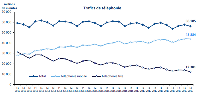 Depuis un an, la consommation vocale diminue en France, au rythme annuel de -2% à -3%. Depuis les postes fixes, le trafic vocal recule depuis l’année 2012, que cela soit à partir des « box » internet ou au départ des réseaux RTC (respectivement -12,6% et -20,2% en un an au deuxième trimestre 2019). L’usage des services de téléphonie mobile, qui représente pratiquement huit minutes de téléphonie sur 10, progresse encore, mais à un rythme inférieur à 2% (+1,9% au deuxième trimestre 2019), ne permettant pas de compenser le recul de la consommation depuis les réseaux fixes. Le volume de minutes consommé depuis l’étranger (1,1 milliard de minutes), après des progressions élevées, continue à augmenter nettement (+15,1% en un an), mais à un rythme inférieur aux croissances enregistrées l’année suivant la mise en application du règlement européen sur les tarifs du roaming en juin 2017.