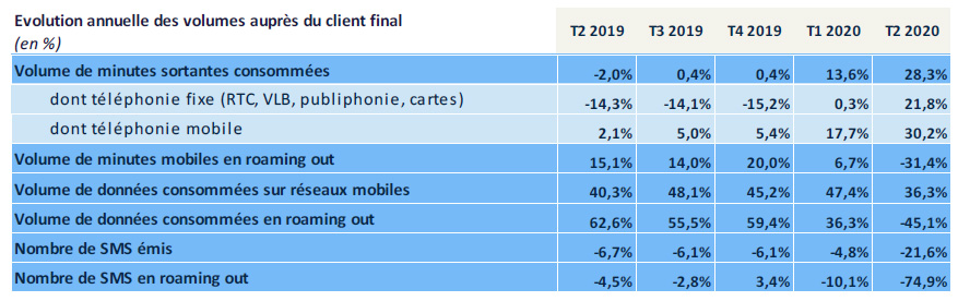 Enfin, les SMS, dont l’usage diminue continûment depuis 2016 au profit des applications mobiles de messageries instantanées (Messenger, Viber, WhatsApp, etc.), voient leur recul s’accentuer significativement ce trimestre (-23% en un an sur le volume global contre environ -6,5% en 2018 et en 2019), alors que le début de la crise sanitaire ne semblait pas avoir eu d’effet significatif. Le trafic émis à l’étranger en roaming out est quant à lui divisé par quatre en un an.