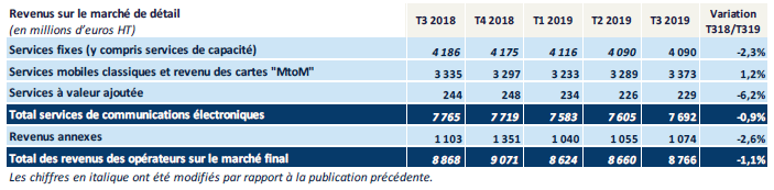 Le revenu des opérateurs sur le marché final diminue d’environ 1% en un an pour le deuxième trimestre consécutif, après un recul deux à trois fois plus élevé les trois trimestres précédents.