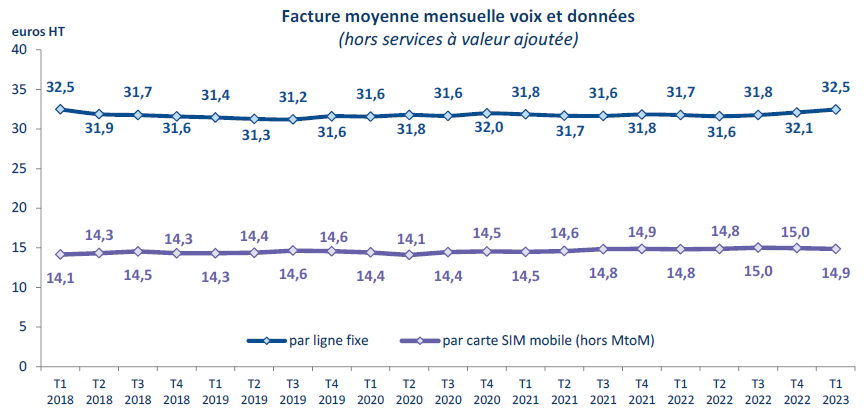 Le revenu des services fixes progresse à nouveau après une année 2022 en léger recul : + 0,7 % en un an ce trimestre après - 0,3 % en 2022 et + 0,5 % environ en 2020 et 2021. Cette progression est liée à un regain de croissance du revenu issu de la vente des abonnements internet à haut et très haut débit (+ 3,4 % en un an au premier trimestre 2023, soit + 0,6 point en un an), alors que la croissance du nombre d’abonnements internet associés connaît à nouveau un ralentissement (+ 1 % contre + 2 % un an auparavant). En conséquence, la facture moyenne des utilisateurs de ces servicesprogresse de 80 centimes en un an et dépasse, pour la première fois depuis cinq ans, 34 euros HT par mois. Parallèlement, le revenu des services bas débit se réduit (- 15 % en un an), comme depuis plus de vingt ans, et le revenu lié à la vente d’accès de haute qualité aux entreprises continue de diminuer à un taux équivalent à celui de l’année 2022, soit - 4 % en un an.
