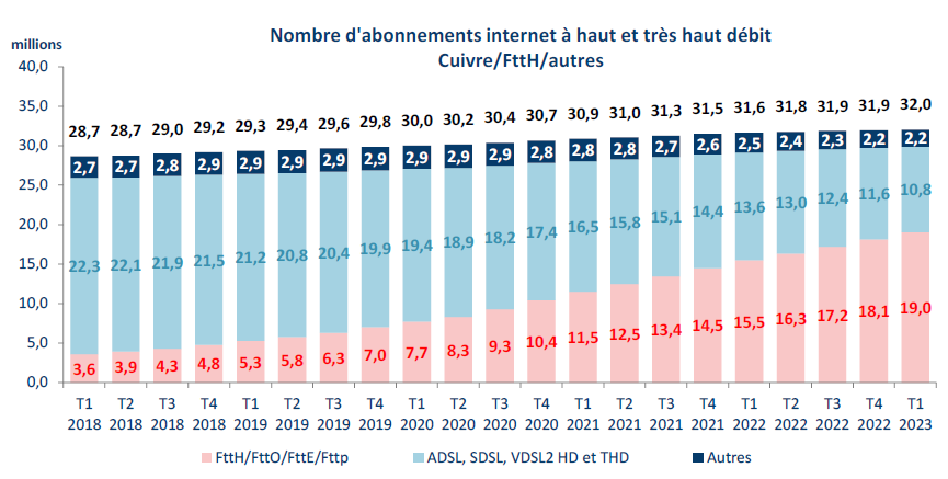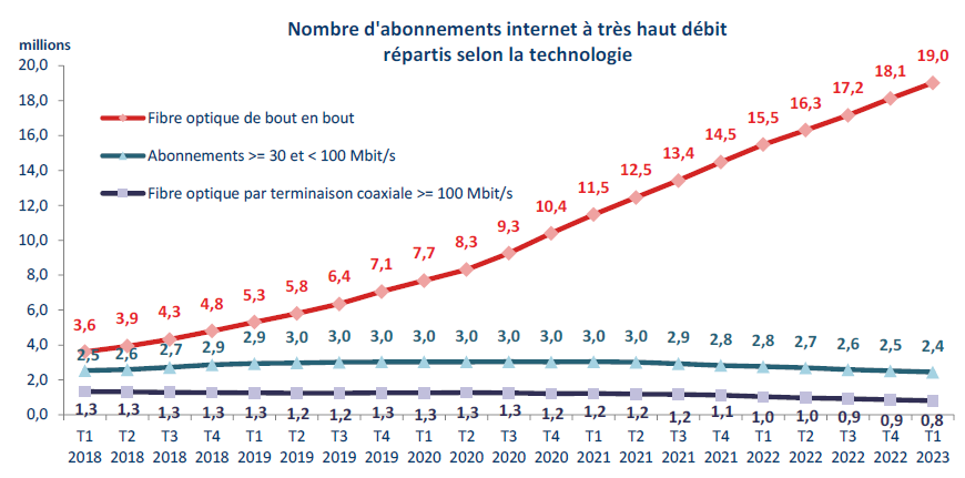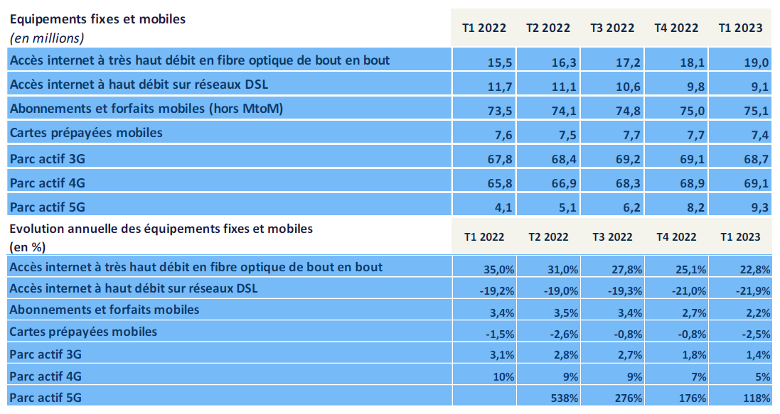 Seul vecteur de croissance, la fibre optique de bout en bout représente près de 60 % du nombre total des abonnements internet en France, soit + 10 points en un an. Le niveau de croissance de ces abonnements reste soutenu : + 3,5 millions en un an ce trimestre contre + 4,0 millions un an auparavant. Plus de la moitié des 35,3 millions de locaux raccordables à la fibre sont ainsi équipés d’un abonnement actif à la fibre, soit 19,0 millions au premier trimestre 2023. Parallèlement, la baisse du nombre d’accès à haut débit se poursuit, notamment sur réseaux DSL, et est comprise entre