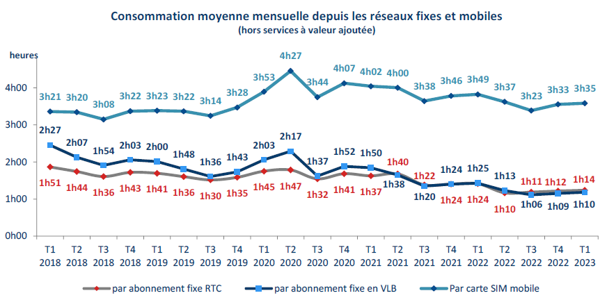 Sur les réseaux fixes, la consommation vocale diminue à nouveau depuis le début de l’année 2021, et à un rythme proche de l’année 2019 depuis deux trimestres (- 17 % en un an au premier trimestre 2023 contre - 21 % un an auparavant). Les consommations moyennes des abonnés en voix sur large bande (- 15 minutes en un an) et des abonnés au RTC (- 10 minutes en un an) sont pratiquement identiques depuis le deuxième trimestre 2021 (1h10 environ par mois au premier trimestre 2023).