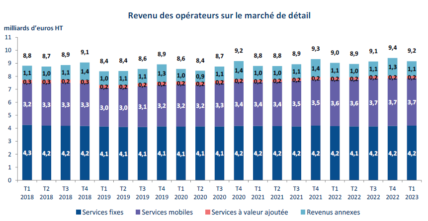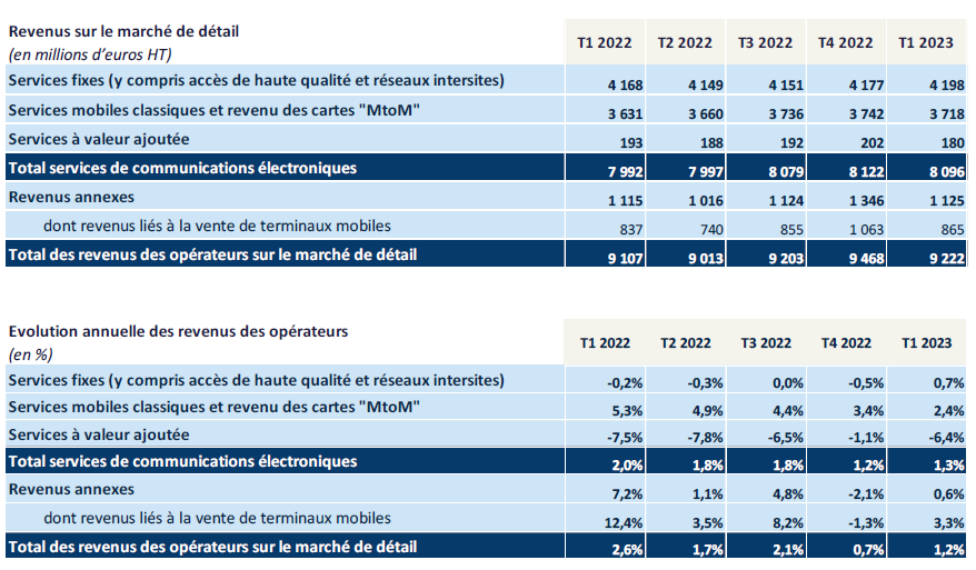 Le revenu s’élève, sur le marché de détail, à 9,2 milliards d’euros HT. Ilcontinue de progresser, mais à un rythme inférieur aux deux années précédentes : + 1,2 % en un an au premier trimestre 2023 après + 1,8 % un an en 2022 et + 2,4 % en 2021. Cette tendance s’explique majoritairement par un ralentissement de la croissance sur le marché mobile. Cependant, tous les postes de revenu sont en croissance ce trimestre à l’exception de celui généré par l’usage des services à valeur ajoutée.