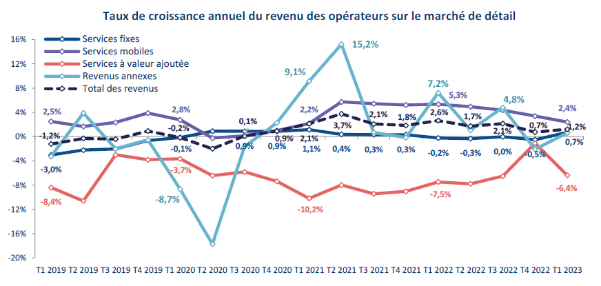 Le revenu des opérateurs sur le marché de détail enregistre, en ce début d’année 2023, une croissance annuelle en léger recul par rapport à l’année 2022.