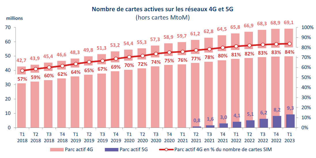 Au 31 mars 2023, la France compte 9,3 millions de cartes SIM actives sur les réseaux 5G.