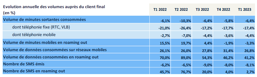 Au total, le nombre de cartes SIM en service s’élève à 82,5 millions de cartes SIM au 31 mars 2023, soit + 1,5 million en un an. Le rythme annuel de croissance du nombre de forfaits, qui était proche de + 2,5 millions depuis le début de l’année 2021, ralentit significativement depuis le quatrième trimestre 2022 (+ 1,6 million ce trimestre). Le nombre de cartes prépayées (7,4 millions au 31 mars 2023) continue de diminuer mais à un rythme nettement inférieur à ceux des années précédentes.