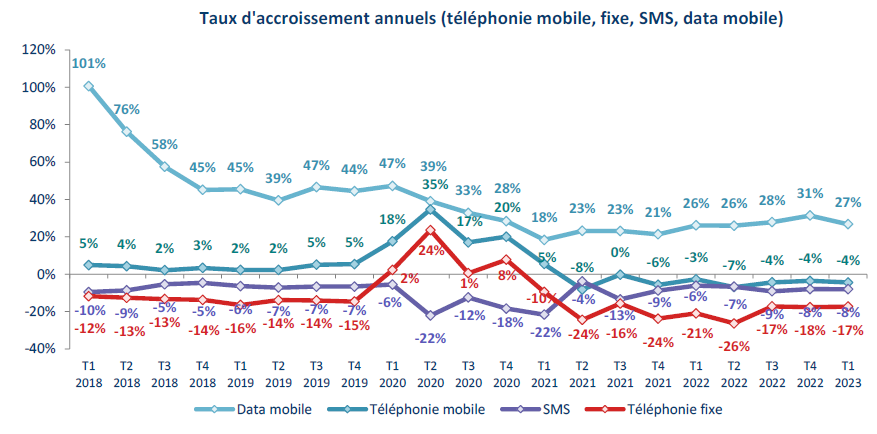 Parmi ces indicateurs figurent par exemple le revenu des opérateurs, le nombre d’abonnements internet à très haut débit sur réseaux fixes, le nombre de cartes SIM actives sur les réseaux 4G et 5G, ou encore la consommation vocale fixe et mobile, les usages de données sur réseaux mobiles ou les usages de SMS.