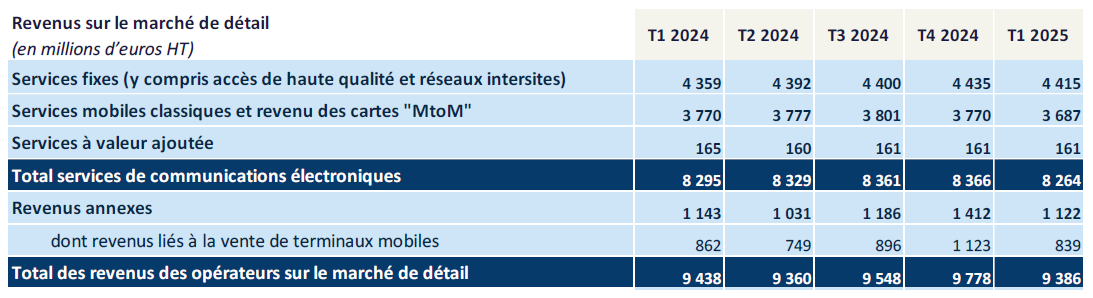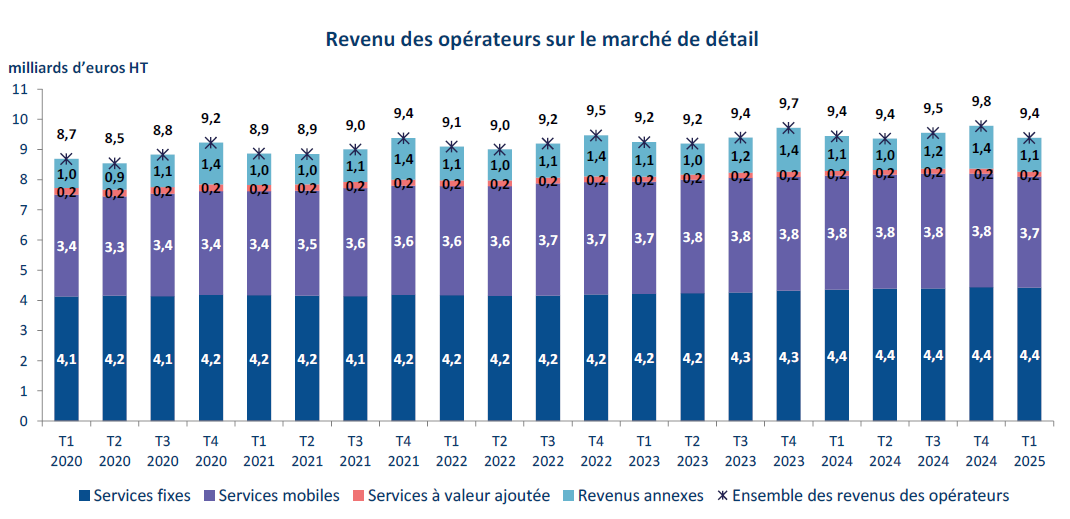 Le revenu des opérateurs sur le marché de détail, 9,4 milliards d’euros HT au premier trimestre 2025, enregistre un léger recul (- 0,5 % en un an) après 4 années et demi de croissance continue. Cette rupture de tendance provient de plusieurs facteurs : le ralentissement de la croissance du revenu des services fixes, en particulier de celui des services internet à haut et très haut débit, et le recul du revenu des services mobiles.