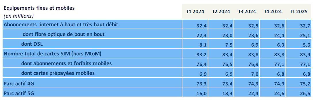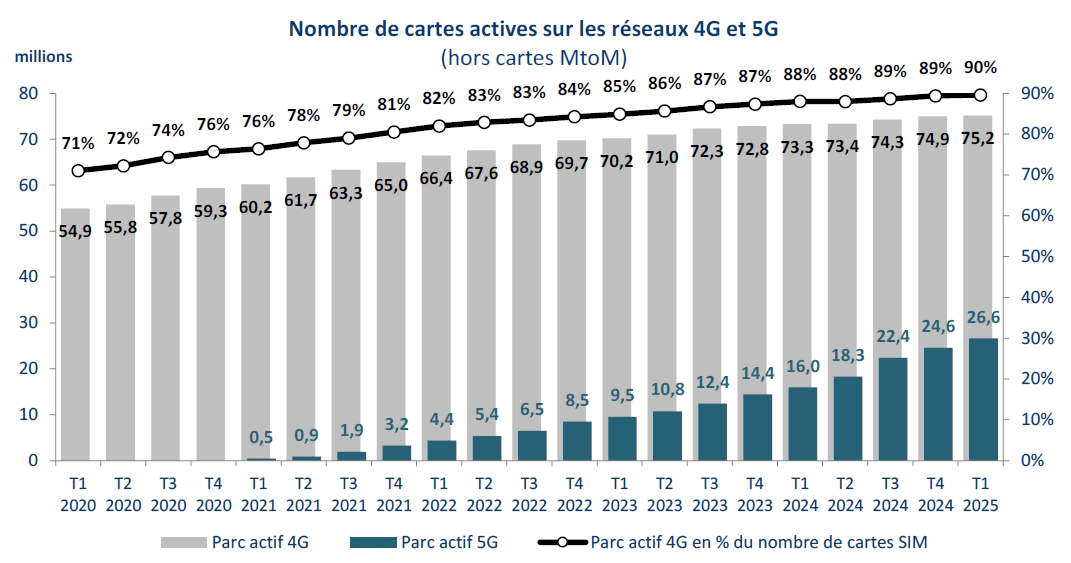 Plus de 26 millions de cartes SIM ont été actives sur les réseaux 5G fin mars 2025.