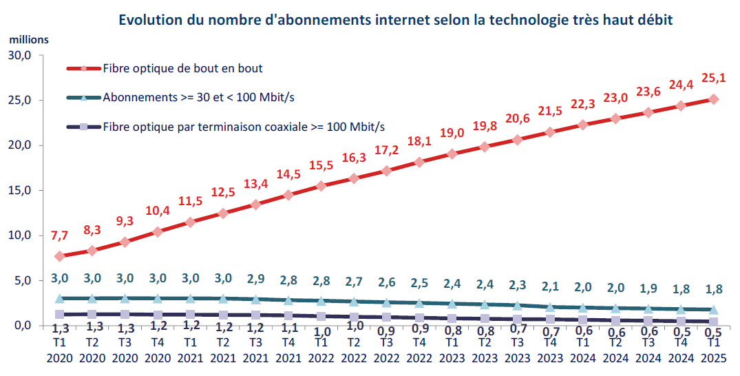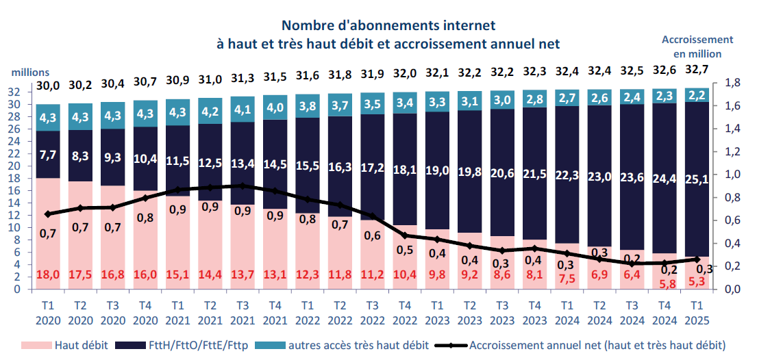 Le nombre d’abonnements internet à haut et très haut débit atteint 32,7 millions fin mars 2025. La croissance s’établit à + 0,8 % en un an au premier trimestre 2025, ce qui représente une augmentation de 260 000 abonnements.