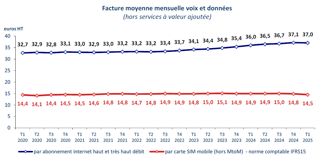 Le revenu issu des ventes des services internet à haut et très haut débit continue de progresser nettement, mais la croissance ralentit pour le deuxième trimestre consécutif : + 3,7 % en un an au premier trimestre 2025 (- 2,6 points en un an). L’impact des hausses tarifaires introduites par les opérateurs à la fin de 2022 et durant l’année 2023[1] s’atténue progressivement. La facture mensuelle moyenne par abonnement internet à haut et très haut débit continue elle de progresser en rythme annuel, en raison de la croissance intervenue les trimestres précédents, mais à un rythme divisé par deux : + 1 euro HT en un an au premier trimestre 2025 contre + 1,9 euro HT un an auparavant. La facture mensuelle moyenne s’élève à 37 euros HT par mois et par abonnement. Le revenu issu de l’ensemble des services fixes (accès à haut et très haut débit et bas débit) s’élève à 4,4 milliards d’euros HT au premier trimestre 2025, en hausse de + 1,3 % en un an (+ 3,5 % un an auparavant).