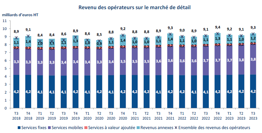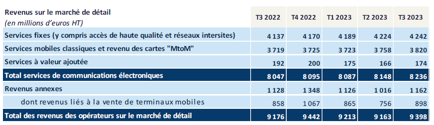 Le revenu s’élève, sur le marché de détail, à 9,4 milliards d’euros HT au troisième trimestre 2023. A l’exception des services spéciaux, tous les postes de revenu qui le composent sont en croissance depuis le début de l’année 2023. La croissance du revenu provient notamment de la croissance du marché mobile, mais également par la progression notable du revenu des services fixes.