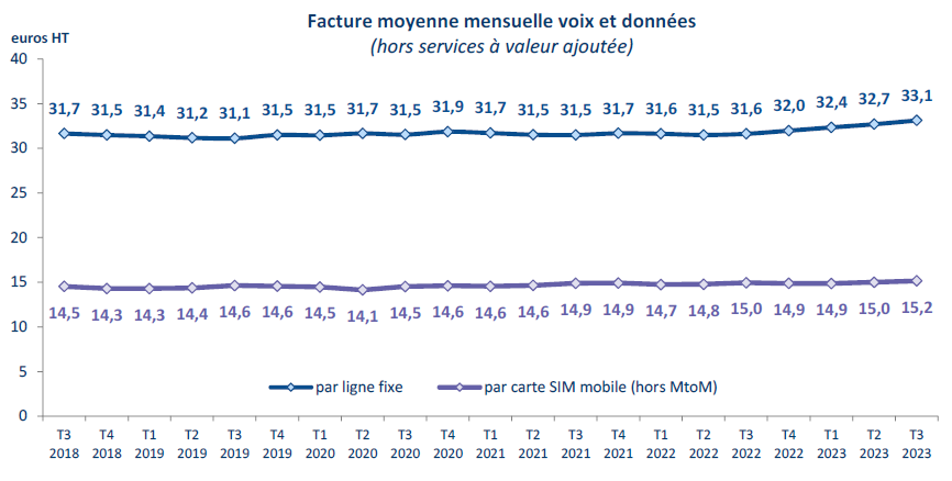 Après une année 2022 de léger ralentissement (- 0,3 % en un an), le revenu des services fixes progresse à nouveau depuis le début de l’année 2023, de plus de 2 % pour le deuxième trimestre consécutif (+ 2,5 % ce trimestre). Cette évolutions’explique par la hausse de trois points de lacroissance du revenu issu de la vente des abonnements internet à haut et très haut débit. La croissance du revenu des abonnements à haut et très haut débit s’élève ainsi à + 5,4 %en un an ce trimestre, un taux qui n’a pas été observé depuis 2012. Parallèlement, le nombre d’abonnements internet associés connaît un ralentissement (+ 1 % contre + 2 % un an auparavant). La facture mensuelle moyenne des utilisateurs des services à haut et très haut débit augmente ainsi de 1,5 € HTen un an au troisième trimestre 2023, conséquence directe des hausses tarifaires survenues sur le marché. La facture des utilisateurs des services fixes à haut et très haut débit s’établit à 34,8 euros HT par mois, un niveau qui n’avait pas été atteint depuis dix ans. Parallèlement, le revenu des services bas débit se réduit depuis plus de vingt ans (- 14 % au troisième trimestre 2023), et le revenu lié à la vente d’accès de haute qualité aux entreprises diminue encore, mais à un rythme deux fois inférieur à 2022 (- 3 % en un an depuis le premier trimestre 2023 après - 6 % en moyenne sur l’ensemble de l’année 2022).