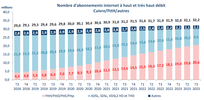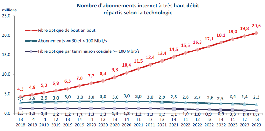 Les utilisateurs d’internet sur les réseaux fixes sont de plus en plus nombreux à être abonnés à la fibre optique, en raison de la croissance du nombre de locaux raccordables à la fibre sur le territoire français (+ 3,9 millions en un an ce trimestre). Le nombre de nouveaux abonnés nets à la fibre optique reste élevé, même s’il ralentit légèrement depuis près de deux ans : + 3,4 millions en un an ce trimestre contre + 3,7 millions un an auparavant. Au total, le nombre d’abonnés à la fibre atteint 20,6 millions fin septembre 2023, ce qui représente 64 % du nombre total d’abonnements internet à haut et très haut débit (+ 10 points en un an) et 87 % du nombre d’abonnements internet à très haut débit (+ 4 points). Plus de la moitié des 37 millions de locaux raccordables à la fibre optique (56 %) sont ainsi équipés d’un abonnement actif. Parallèlement, la baisse du nombre d’abonnements à haut débit se poursuit, notamment sur réseaux DSL, et est comprise entre - 2,5 et - 3 millions par an depuis deux ans. Au total, le nombre d’abonnements internet à haut et très haut débit (32,2 millions)enregistre une croissance en repli d’environ un point en rythme annuel depuis le début de l’année 2022. La croissance s’établit à environ + 1 % en un an depuis quatre trimestres, ce qui correspond à une augmentation comprise entre 300 000 et 400 000 accès supplémentaires en un an.
