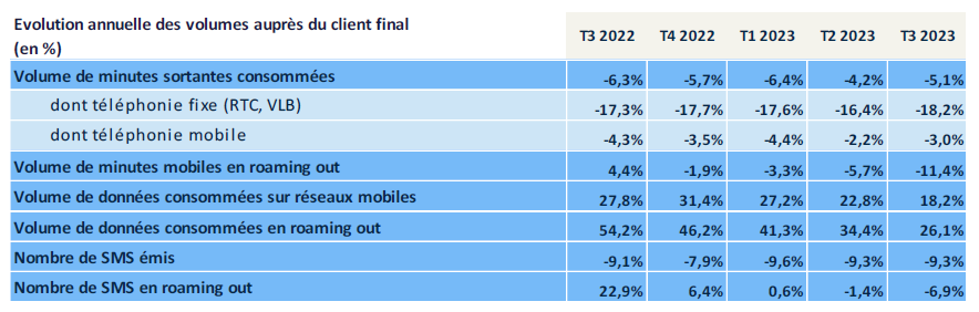 [1] Les parcs actifs 3G, 4G et 5G sont définis comme le nombre de clients ayant accédé au cours des trois derniers mois (en émission ou en réception) à un service mobile utilisant l’une de ces technologies d’accès radio. Ces rubriques ne sont pas exclusives : un consommateur ayant utilisé les réseaux 3G, 4G et 5G au cours du trimestre sera comptabilisé dans chacun de ces indicateurs.