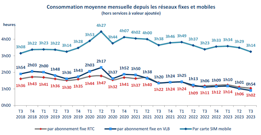 Sur les réseaux fixes, après une année 2020 de croissance, le trafic vocal diminue à nouveau, avec plus d’intensité qu’en 2019 : environ - 20 % en un an depuis 2021 contre - 15 % en moyenne en 2019. Les consommations moyennes des abonnés en voix sur large bande (- 12 minutes en un an) et des abonnés au RTC(- 9 minutes en un an) s’élèvent respectivement à 54 minutes et 1h02 par mois ce trimestre.
