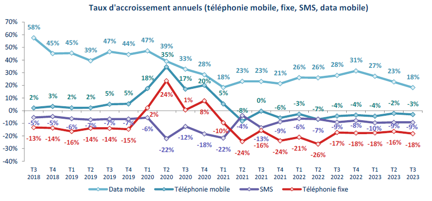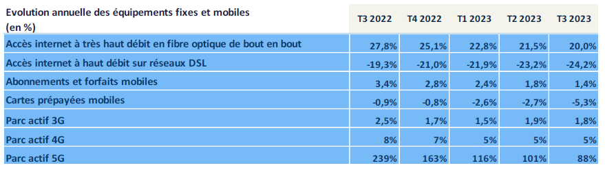 Parmi ces indicateurs figurent par exemple le revenu des opérateurs, le nombre d’abonnements internet à très haut débit sur réseaux fixes, le nombre de cartes SIM actives sur les réseaux 4G et 5G, ou encore la consommation vocale fixe et mobile, les usages de données sur réseaux mobiles ou les usages de SMS.