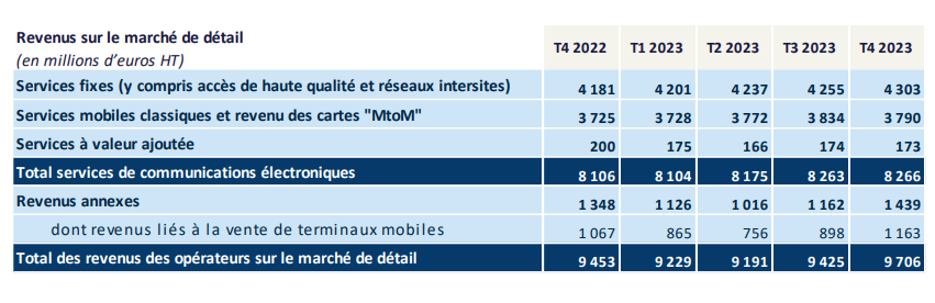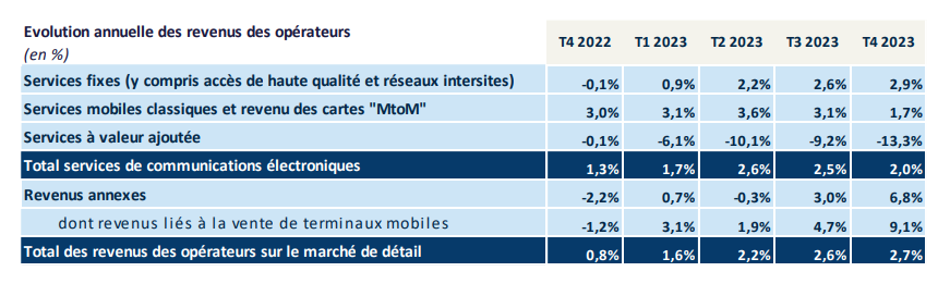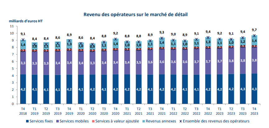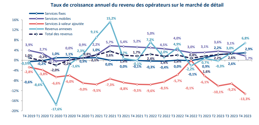 La hausse du revenu des opérateurs sur le marché de détail se poursuit, avec une croissance de 2,7 % en un an au quatrième trimestre 2023.