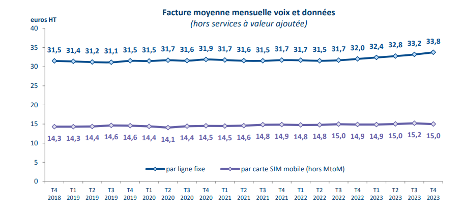 Hors revenus annexes, le revenu des services fixes est, ce trimestre, celui qui contribue le plus à la croissance du marché de détail. En repli depuis 2011 en raison du recul du revenu des services bas débit (- 15 % en un an ce trimestre), le revenu des services fixes enregistre une amélioration depuis 2020, avec un taux de croissance qui n’a cessé d’augmenter au cours de l’année 2023 (+ 2,9 % en un an au quatrième trimestre), et ce, malgré le ralentissement de la croissance du nombre d’abonnements internet à haut et très haut débit (+ 1,1 % en un an au quatrième trimestre 2023 contre + 2,1 % au quatrième trimestre 2022). En effet, le revenu issu de la vente des abonnements internet à haut et très haut débit n’avait pas connu une telle croissance depuis dix ans : + 5,9 % ce trimestre, soit + 3 points de croissance en un an.La facture mensuelle moyenne par abonnement internet à haut et très haut débit augmente ainsi de 1,7 € HTen un an au quatrième trimestre 2023, et s’établit à 35,4 euros HT par mois.