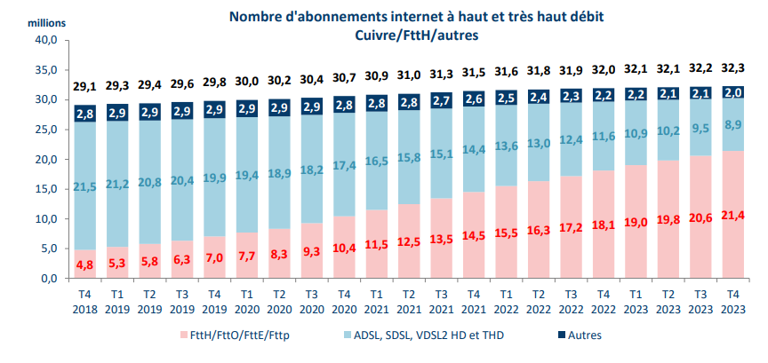 Au total, le nombre d’abonnements internet à haut et très haut débit atteint 32,3 millions. La croissance du nombre de ces abonnements s’élève à + 1 % en un an (contre +2,1 % un an auparavant), ce qui correspond à une augmentation comprise entre 300 000 et 400 000 accès supplémentaires depuis un an. Cette période fait suite à des croissances inédites comprises entre + 800 000 et + 900 000 accès.