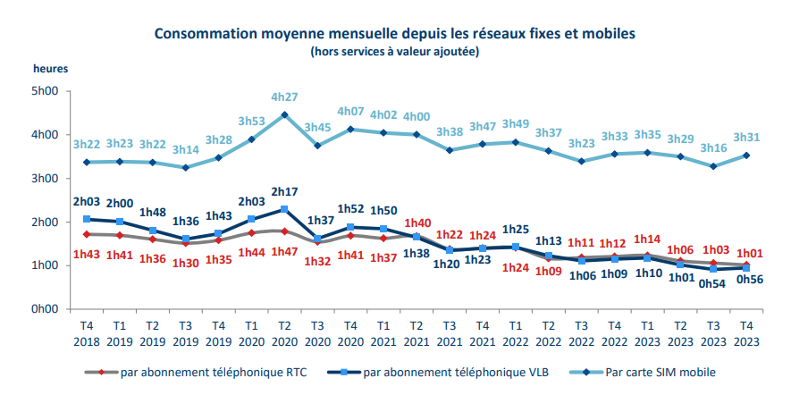 Alors que l’usage moyen issu des réseaux mobiles se maintient à un niveau de plus de trois heures par mois depuis neuf ans, celui issu des réseaux fixes s’amenuise d’année en année. Un abonné à la téléphonie fixe (technologies RTC et VLB confondues) consomme, depuis sa ligne fixe, 58 minutes par mois en moyenne au quatrième trimestre 2023 (- 12 minutes en un an) contre près de 4 heures par mois dix ans auparavant. Au total, la consommation vocale depuis les réseaux fixes et mobiles s’élève à 56,8 milliards de minutes ce trimestre.
