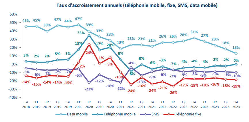Parmi ces indicateurs figurent par exemple le revenu des opérateurs, le nombre d’abonnements internet à très haut débit sur réseaux fixes, le nombre de cartes SIM actives sur les réseaux 4G et 5G, ou encore la consommation vocale fixe et mobile, les usages de données sur réseaux mobiles ou les usages de SMS.
