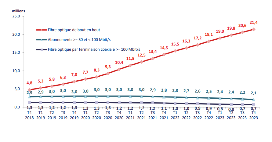Deux tiers des abonnements internet à haut et très haut débit sont en fibre optique au quatrième trimestre 2023.