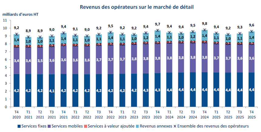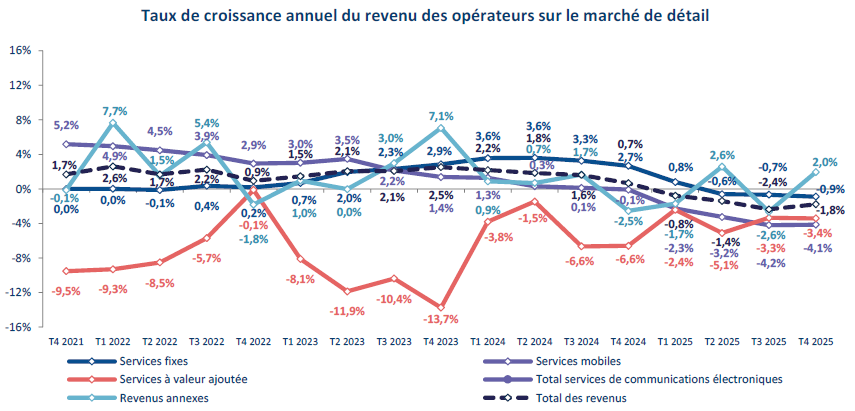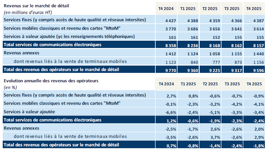 Le revenu des opérateurs sur le marché de détail s’élève à 9,6 milliards d’euros HT au quatrième trimestre 2025. Il diminue depuis le début de l’année 2025, à un rythme qui s’est intensifié : - 2,1 % en un an au deuxième semestre 2025 après - 1,1 % au premier semestre. Tous les postes de revenus sont en recul à l’exception des revenus annexes.