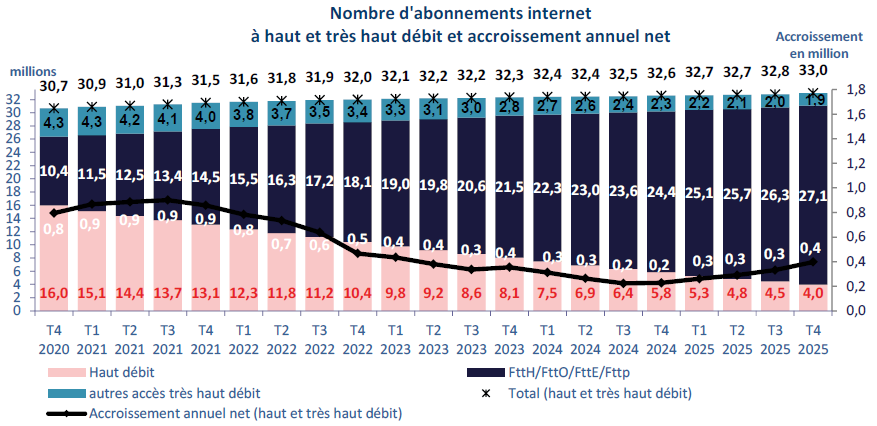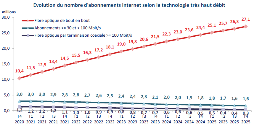 La croissance du nombre d’abonnements internet est portée majoritairement par la fibre optique. Fin décembre 2025, 27,1 millions d’abonnements internet sont en fibre optique, en hausse de 2,7 millions d’abonnements en un an, contre + 2,9 millions un an auparavant. Ces abonnements représentent désormais 82 % du nombre total d’abonnements internet (+ 7 points en un an) et 93 % du nombre total d’abonnements internet à très haut débit (+ 2 points en un an).