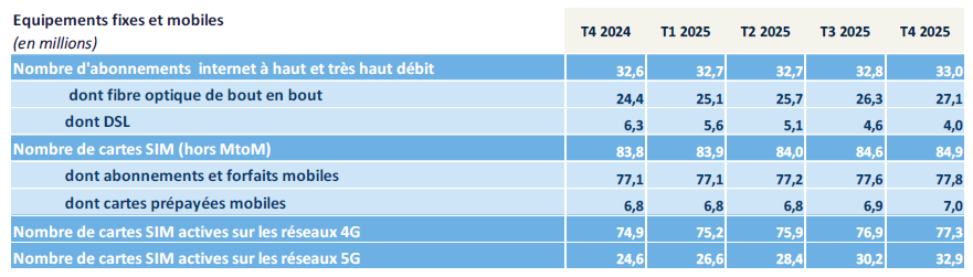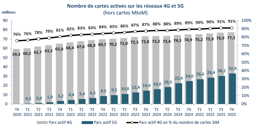 Au quatrième trimestre 2025, le nombre cartes SIM actives sur les réseaux 5G s’élève à 32,9 millions.
