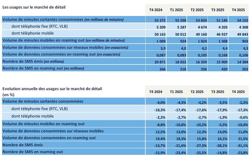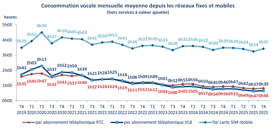 S’agissant de l’usage vocal, les utilisateurs des réseaux mobiles ont consommé 49,8 milliards de minutes au quatrième trimestre 2025. Environ 70 % de ce trafic a été effectué via le réseau LTE, quand un peu moins de 10 % l’a été en Wi-Fi. En moyenne, la consommation mensuelle vocale des abonnés mobiles reste élevée, au contraire du trafic moyen par ligne fixe. Au quatrième trimestre 2025, l’usage vocal par ligne mobile s’élève en moyenne à 3h25 par mois (- 4 minutes en un an), contre 40 minutes par mois par ligne fixe (- 7 minutes en un an et - 2h30 en dix ans).