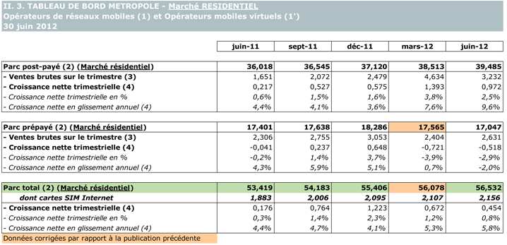 (1’) Opérateurs mobiles virtuels de métropole indépendants des opérateurs de réseau mobile (ORM) et actifs sur le trimestre : Afone, Auchan Telecom, Bazile Telecom, Carrefour mobile, Coriolis Telecom, E-plus (KPN), IC Telecom, La Poste Telecom, Lebara mobile, Legos, Lycamobile, Mobeel, NRJ Mobile, Numéricable, Omer mobile, Omer Telecom, Ortel Mobile, Prixtel, SCT Telecom, Sim +, Sisteer, Symacom, Transatel, Zéro forfait.