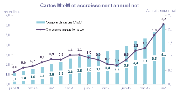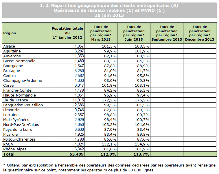 (5) Le taux de pénétration est obtenu en divisant le nombre total de clients ou le nombre de clients "actifs" par la population considérée. La publication du SIM effectuée en décembre 2006 a réactualisé les populations issues du recensement décennal de l'INSEE en date du 1er janvier 1999. Désormais la population de référence est celle publiée par l'INSEE au 1er janvier de l'année considérée, sans réactualisation rétroactive. Au 1er janvier de l'année N, l'INSEE publie les estimations de population du 1er janvier de l'année N-1. Ainsi, la population de référence en 2013, issue des estimations publiées en janvier 2013 (et donc portant sur la population au 1er janvier 2012), comprend une population métropolitaine de 63 409 191 personnes, à laquelle s'ajoute, au titre des DOM et des COM, une population de 2 242 271 personnes, se décomposant notamment en 1 081 000 personnes pour la zone Antilles-Guyane et 1 054 959 pour la zone Réunion-Mayotte.