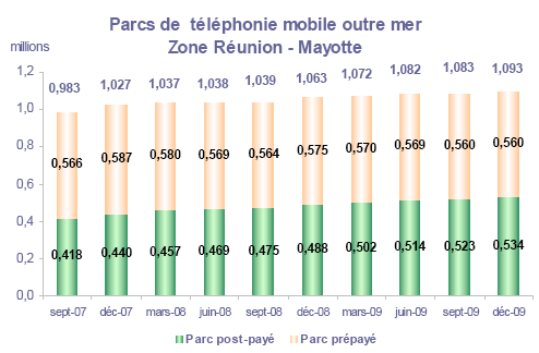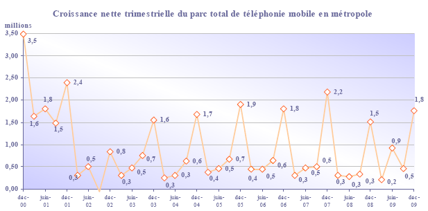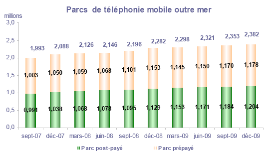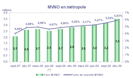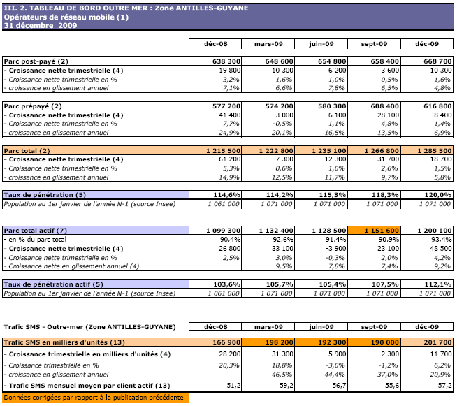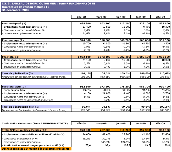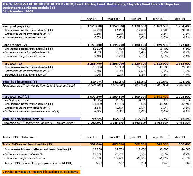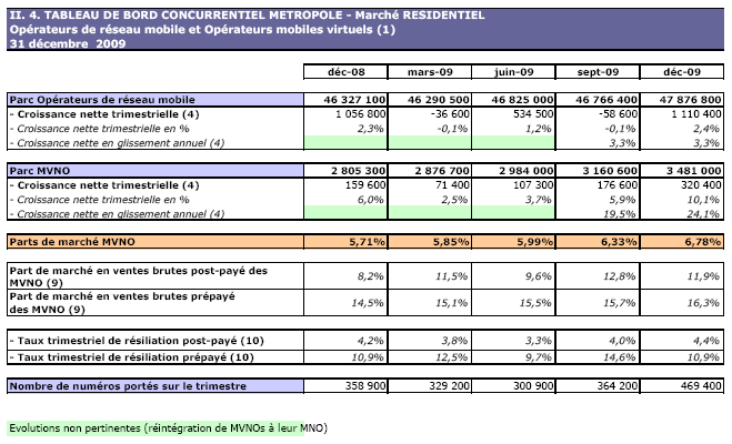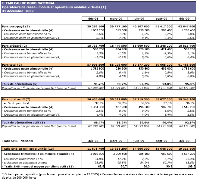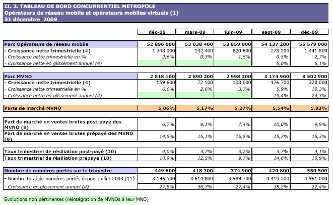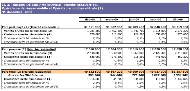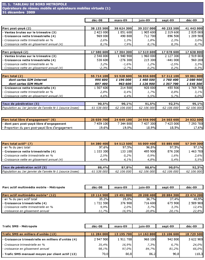 (1) Opérateurs de réseau mobile de métropole : Orange France, Société Française du Radiotéléphone (SFR), Bouygues Telecom et MVNO actifs contrôlés par les opérateurs de réseau et comptabilisés comme tels : Débitel, Ten et Neuf Cegetel. Opérateurs mobiles virtuels de métropole indépendants des ORM et actifs sur le trimestre : Afone, Auchan Télécom, Bazile Telecom, Carrefour mobile, Coriolis, E-plus, France Télécom, Mobisud, NRJ Mobile, Numéricable, Omer Telecom, Sim +, Tele2, Transatel, Zero Forfait. Opérateurs de réseau mobiles outre-mer : Orange Caraïbe, filiale d'Orange France ; Orange Réunion, filiale d'Orange France ; Société Réunionnaise du Radiotéléphone (SRR), y compris sous la marque Mayotte Télécom Mobile à Mayotte, filiale de SFR ; Digicel AFG ; SAS SPM, filiale d'Orange Caraïbe à Saint Pierre et Miquelon ; Dauphin Telecom ; Outremer Telecom ; UTS Caraïbe.
