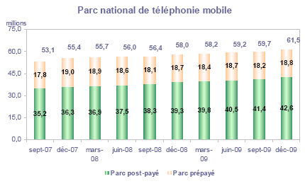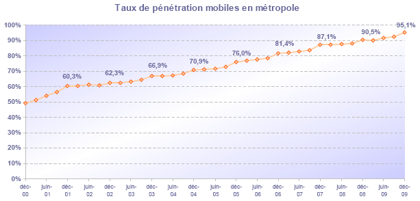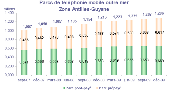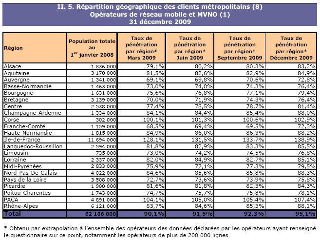 (5) Le taux de pénétration est obtenu en divisant le nombre total de clients ou le nombre de clients "actifs" par la population considérée. La publication du SIM effectuée en décembre 2006 a réactualisé les populations issues du recensement décennal de l'INSEE en date du 1er janvier 1999. Désormais la population de référence est celle publiée par l'Insee au 1er janvier de l'année considérée, sans réactualisation rétroactive. Au 1er janvier de l'année N, l'Insee publie les estimations de population du 1er janvier de l'année N-1. Ainsi, la population de référence en 2009, issue des estimations publiées en janvier 2009 (et donc portant sur la population au 1er janvier 2008), comprend une population métropolitaine de 62 106 000 personnes, à laquelle s'ajoute, au titre des DOM, une population de 2 065 800 personnes, se décomposant notamment en 1 071 000 personnes pour la zone Antilles-Guyane et 788 500 pour la zone Réunion-Mayotte.