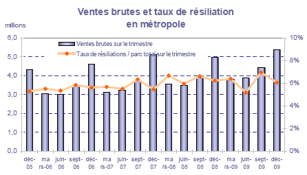 (10) Le taux de résiliation post-payé trimestriel est le rapport entre les résiliations post-payé du trimestre et le parc moyen post-payé sur la période la (demie somme des parcs post-payé en début et en fin de trimestre). Le taux de résiliation prépayé trimestriel est le rapport entre les résiliations prépayé du trimestre et le parc moyen prépayé sur la période (demie somme des parcs prépayé en début et en fin de trimestre). A noter qu'une résiliation se définit comme un client de l'opérateur en début de trimestre dont l'enregistrement au HLR a été effacé au cours du trimestre. Les modifications de l'enregistrement au HLR ne constituent pas, en particulier, des résiliations. Cette définition ne recouvre donc ni les changements d'offres au sein de la gamme, ni les migrations prépayé vers post-payé ou post-payé vers prépayé, ni les suspensions de services.