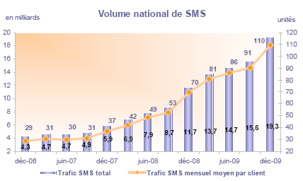 (13) Le trafic trimestriel de SMS ("Short Message Service") correspond à l'ensemble des SMS envoyés (SMS sortants) sur le trimestre. Les données relatives à St-Pierre et Miquelon ne sont pas prises en compte. Le trafic SMS mensuel par client actif moyen correspond au trafic trimestriel de SMS divisé par 3, rapporté au parc de clients actifs moyen ((Parc de clients actifs de la fin du trimestre précédent + Parc de clients actifs de la fin du trimestre considéré)/2).