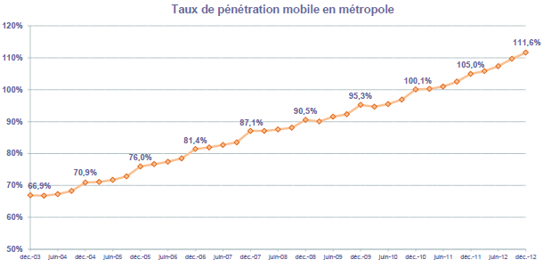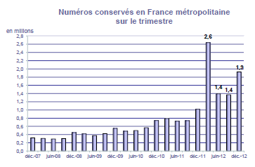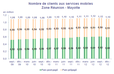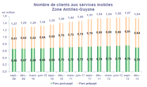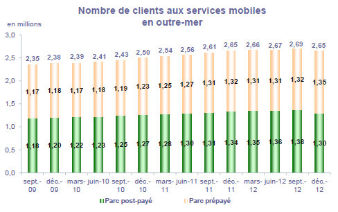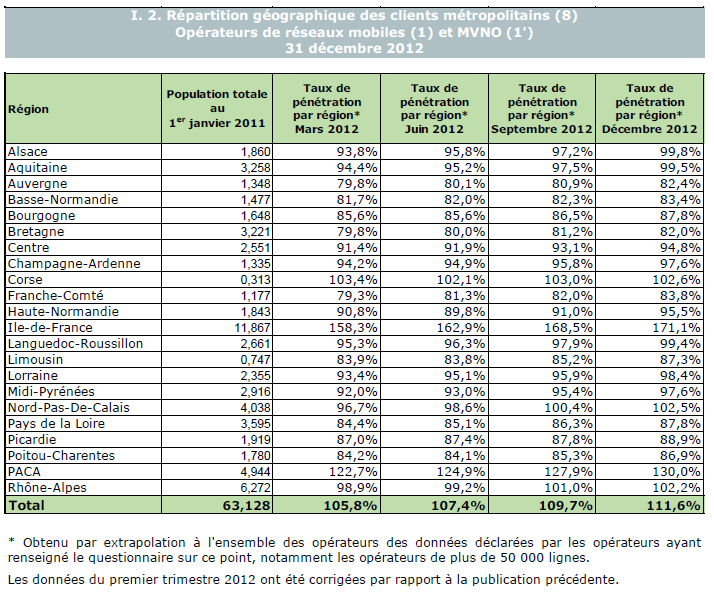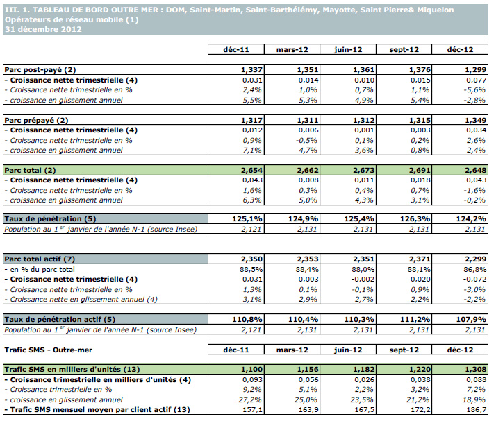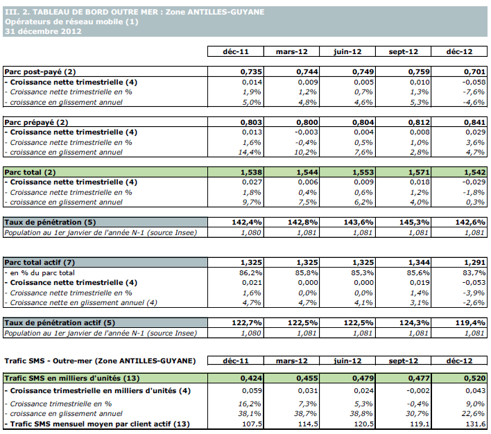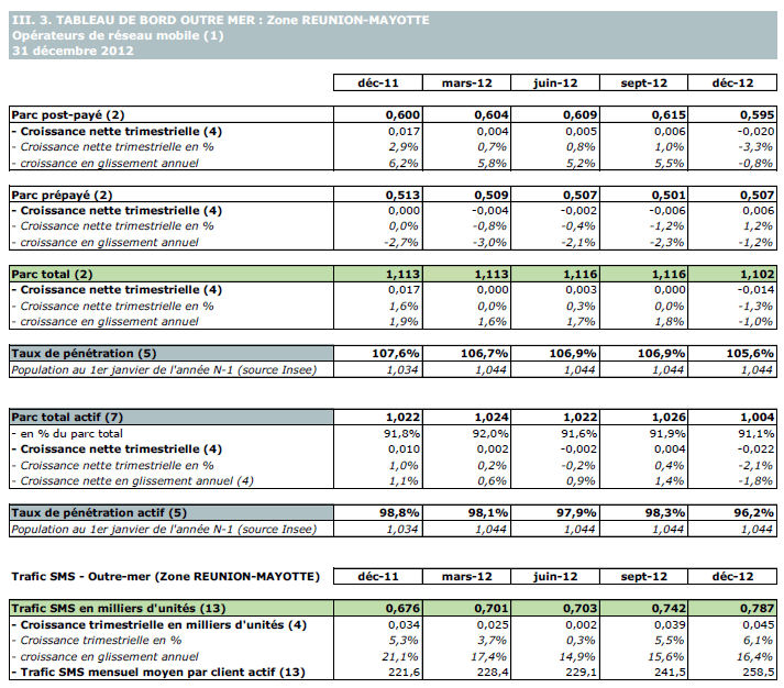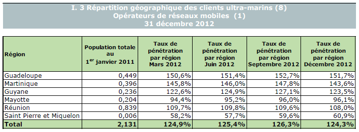 (5) Le taux de pénétration est obtenu en divisant le nombre total de clients ou le nombre de clients "actifs" par la population considérée. La publication du SIM effectuée en décembre 2006 a réactualisé les populations issues du recensement décennal de l'INSEE en date du 1er janvier 1999. Désormais la population de référence est celle publiée par l'INSEE au 1er janvier de l'année considérée, sans réactualisation rétroactive. Au 1er janvier de l'année N, l'INSEE publie les estimations de population du 1er janvier de l'année N-1. Ainsi, la population de référence en 2012, issue des estimations publiées en janvier 2012 (et donc portant sur la population au 1er janvier 2011), comprend une population métropolitaine de 63 127 768 personnes, à laquelle s'ajoute, au titre des DOM et des COM, une population de 2 131 393 personnes, se décomposant notamment en 1 081 455 personnes pour la zone Antilles-Guyane et 1 043 593 pour la zone Réunion-Mayotte. La population actualisée de Mayotte au 1er janvier 2011 est issue d'une estimation de la Banque mondiale.