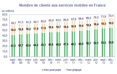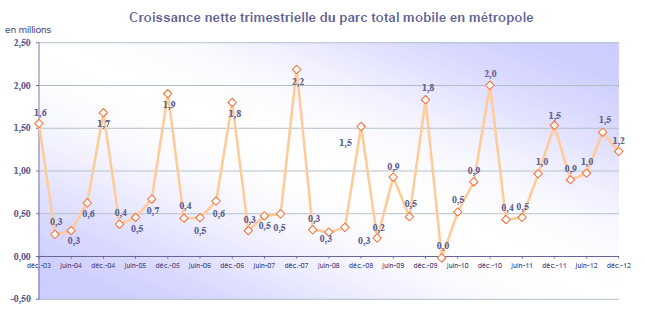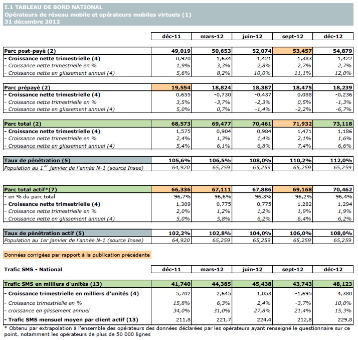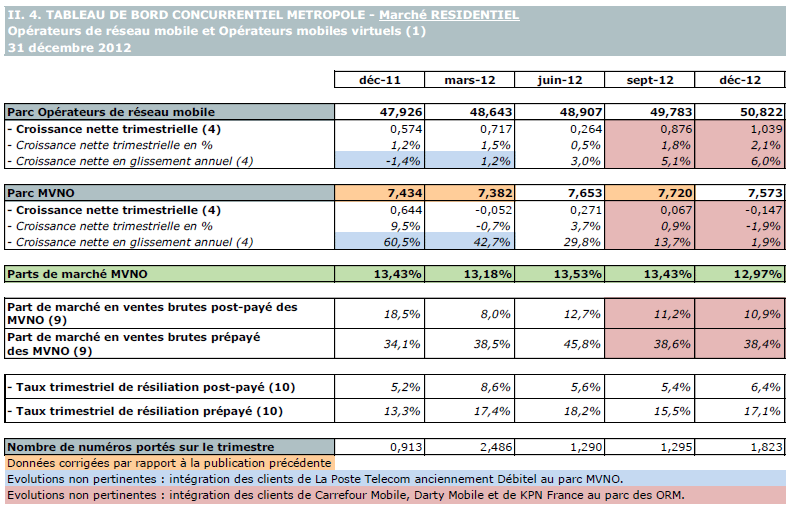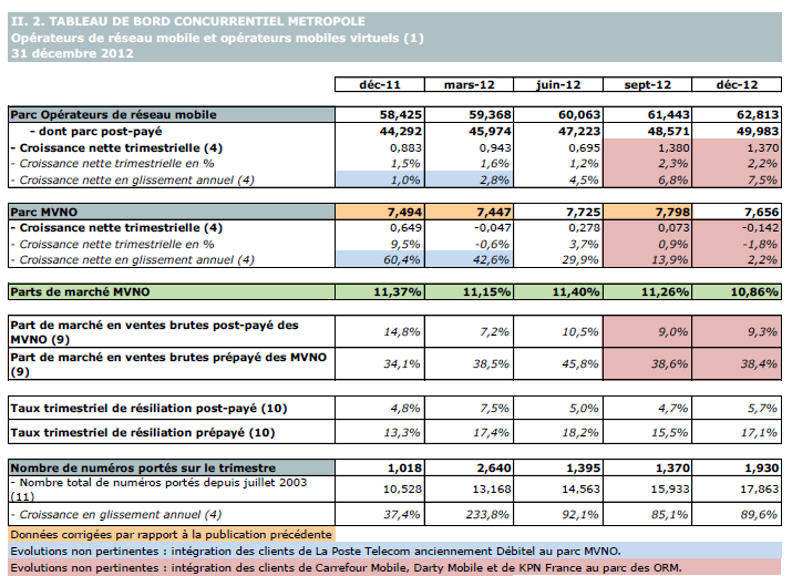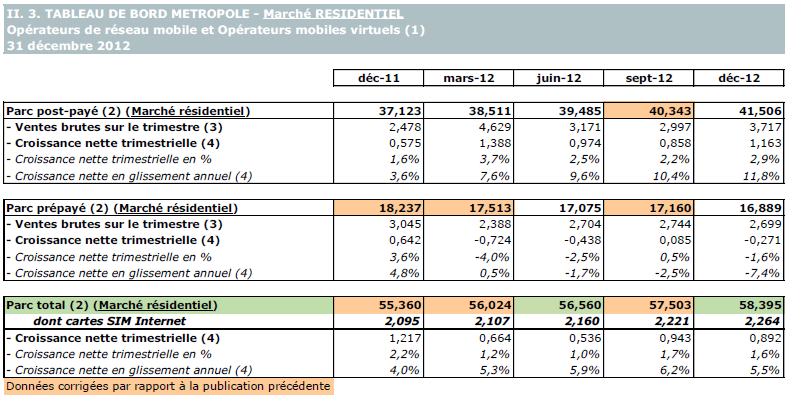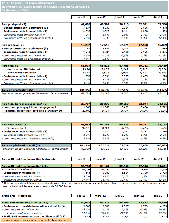 (1) Opérateurs de réseaux mobiles de métropole : Orange France, Société Française du Radiotéléphone (SFR), Bouygues Telecom, Free mobile et MVNO actifs contrôlés par les opérateurs de réseaux : BuzzMobile, Carrefour mobile, Darty Mobile, E-plus (KPN France), France Télécom et SNBL.