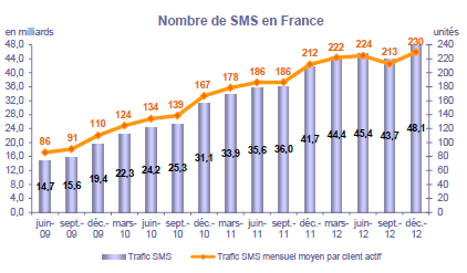(13) Le trafic trimestriel de SMS ("Short Message Service") correspond à l'ensemble des SMS envoyés (SMS sortants) sur le trimestre. Les données relatives à Saint-Pierre et Miquelon ne sont pas prises en compte. Le trafic SMS mensuel par client actif moyen correspond au trafic trimestriel de SMS divisé par 3, rapporté au parc de clients actifs moyen ((Parc de clients actifs de la fin du trimestre précédent + Parc de clients actifs de la fin du trimestre considéré)/2).